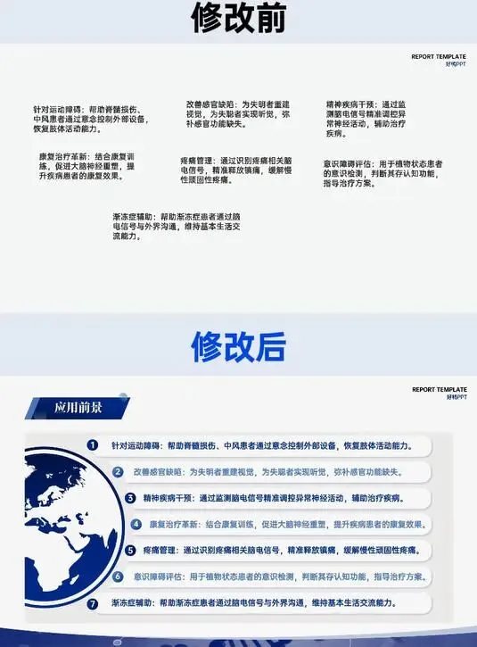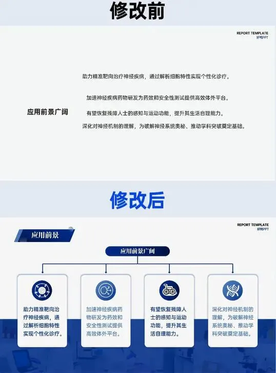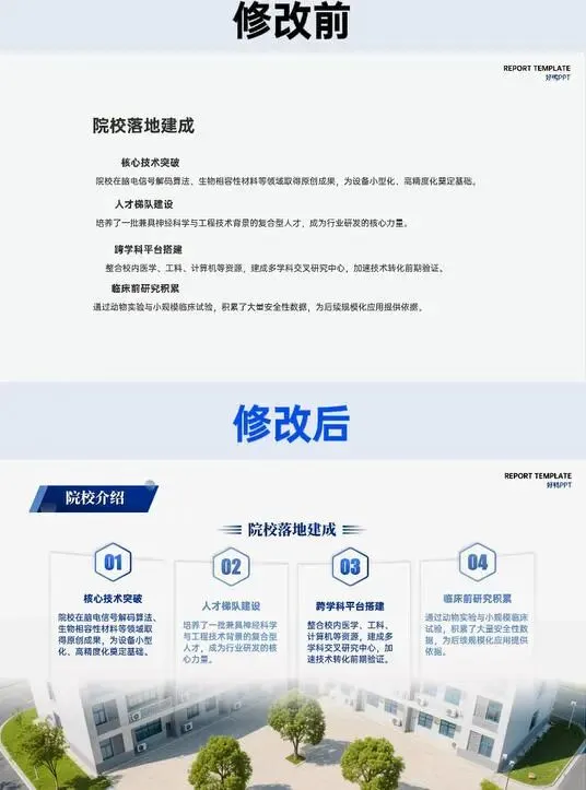 成果与前景板块的排版升级更具说服力。修改前 “应用前景” 文字密集挤压,段落无分区;修改后采用四栏式布局,将 “精准治疗、药物研发、功能恢复、机制研究” 四大方向模块化呈现,标题与内容对齐统一,关键信息一目了然。院校介绍页则用序号串联 “落地建成、技术突破、人才梯队、平台搭建”,替代修改前的杂乱罗列,让支撑条件的呈现更具逻辑链。