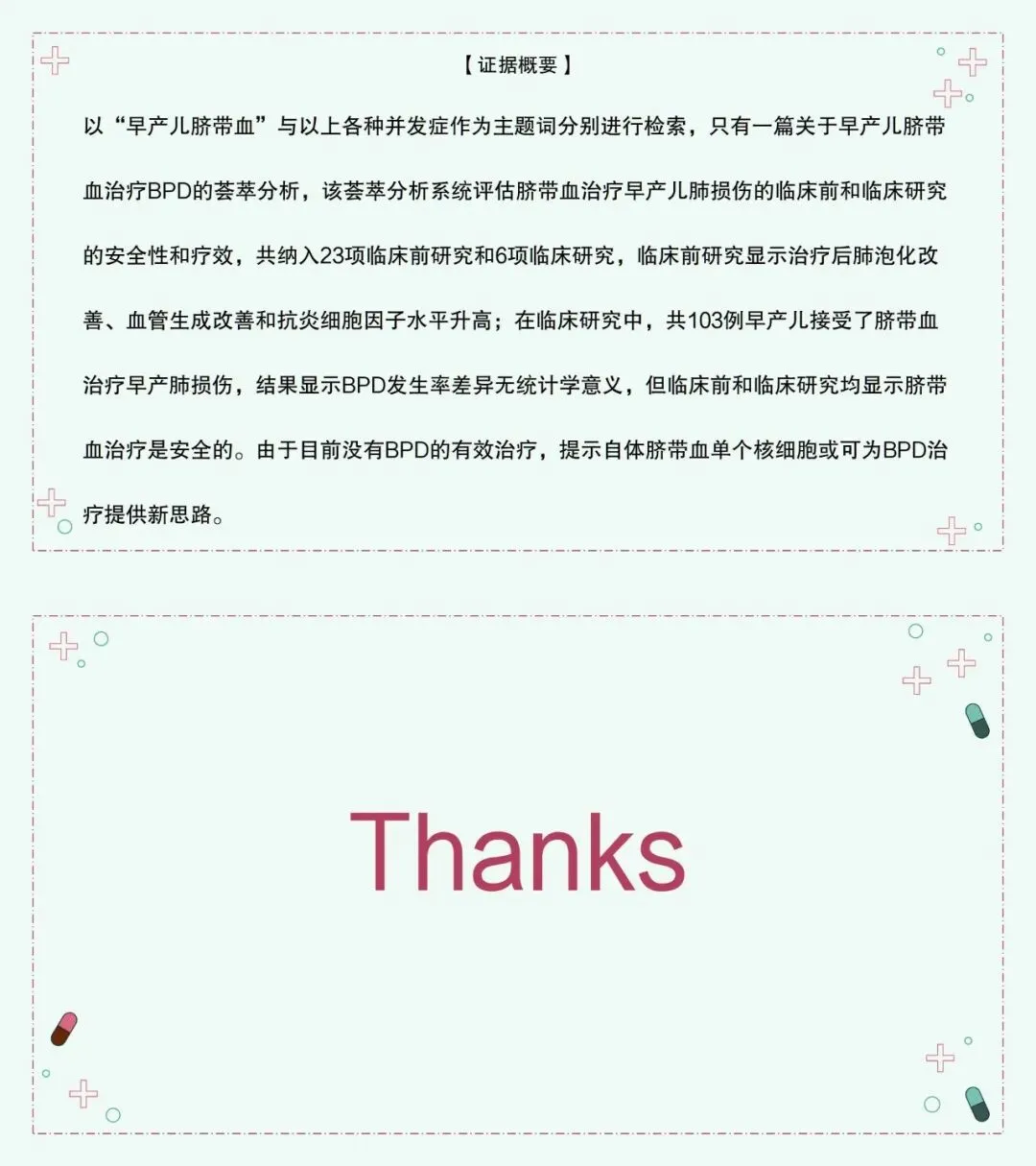 (7)早产儿常见的严重并发症包括BPD、颅内出血、早产儿视网膜病、早产儿坏死性小肠结肠炎,目前均无有效治疗。已有研究证明早产儿自体脐带血防治早产儿慢性肺损伤的安全性,但有效性仍需随机双盲对照临床研究证实。