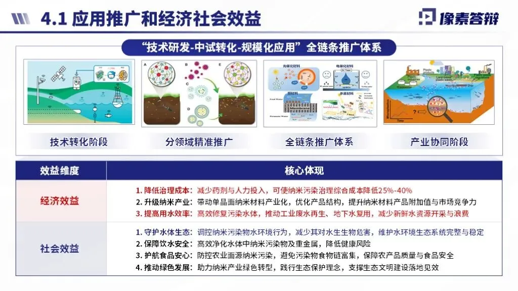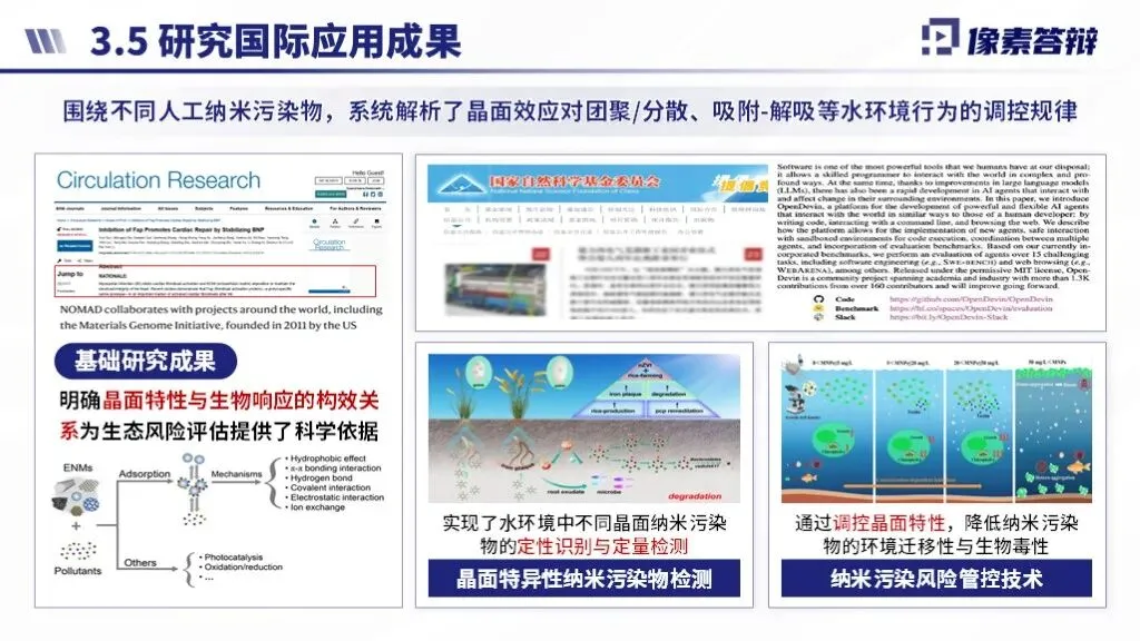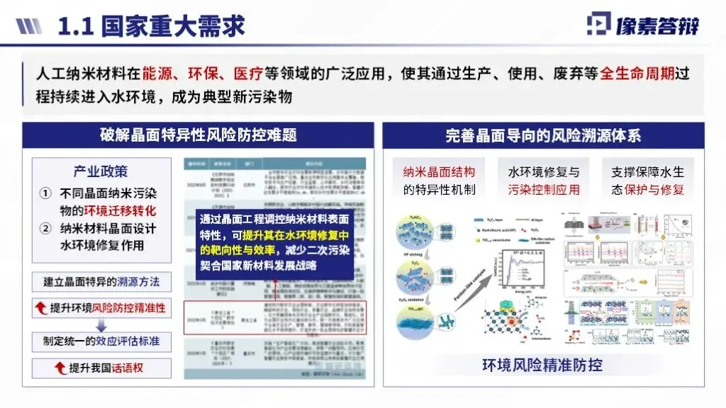 PPT 开篇紧扣人工纳米材料广泛应用带来的水环境新污染问题,明确项目旨在破解晶面特异性风险防控难题,完善晶面导向的风险溯源体系,提升我国在该领域的环境风险防控精准性与国际话语权,契合国家生态安全战略需求。