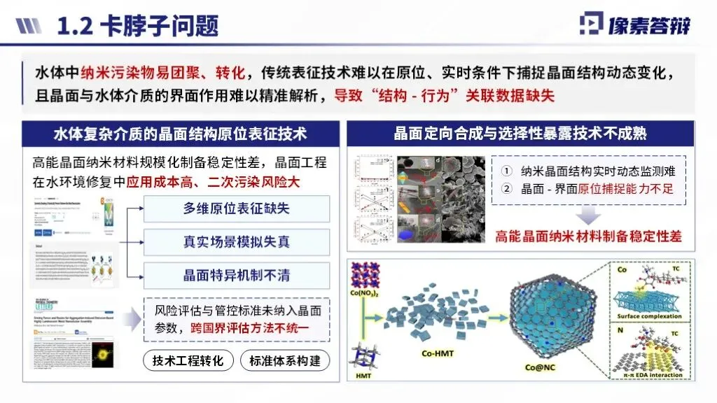 系统梳理当前研究面临的两大核心难题:一是水体中纳米污染物晶面结构原位表征技术缺失,难以捕捉其动态变化;二是晶面定向合成与选择性暴露技术不成熟,导致 “结构 - 行为” 关联数据缺失,为后续创新突破划定清晰路径。