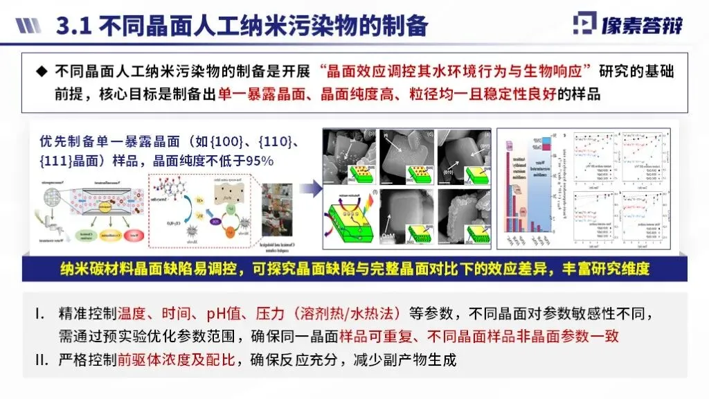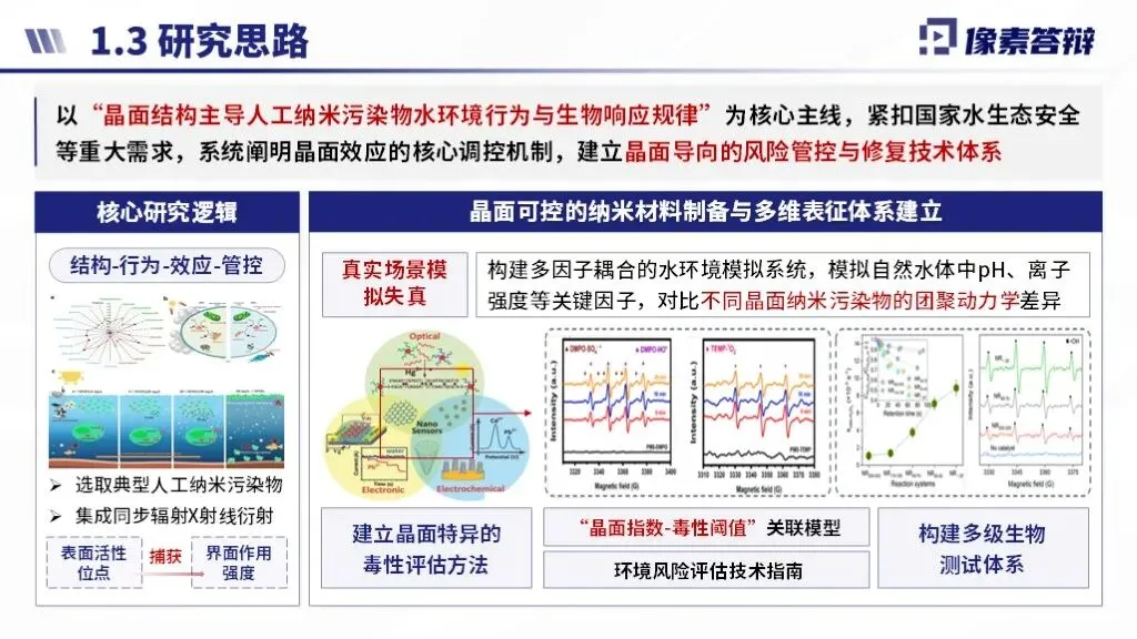 提出以 “晶面结构主导人工纳米污染物水环境行为与生物响应规律” 为核心主线,通过建立多因子耦合的水环境模拟系统、构建 “晶面指数 - 毒性阈值” 关联模型等手段,系统阐明晶面效应的核心调控机制,形成完整的研究逻辑闭环。