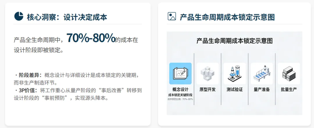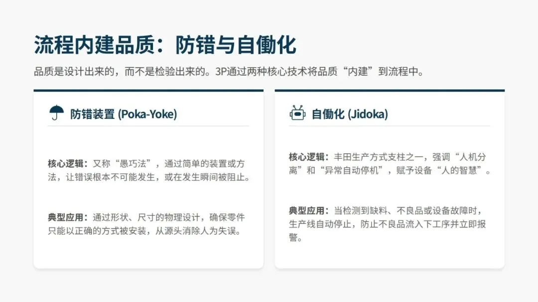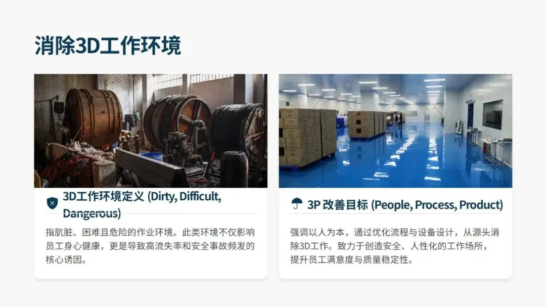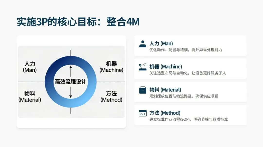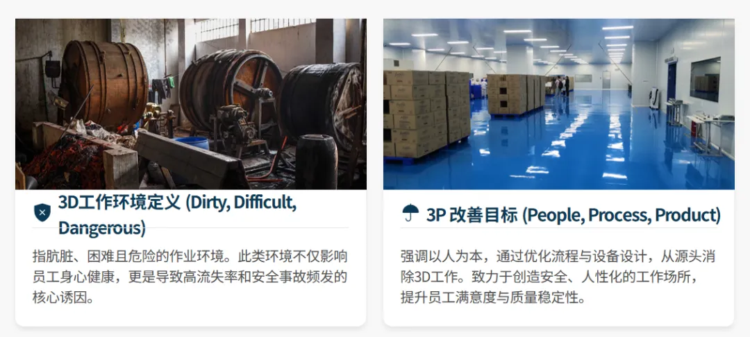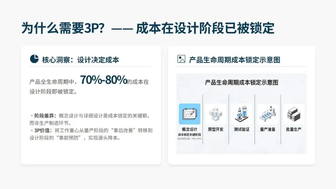 产品全生命周期中 70%-80% 的成本在设计阶段就已锁定,3P 正是通过设计阶段的事前预防,替代量产阶段的事后改善,从根源实现降本增效。其核心目标是整合人、机、料、法 4M 要素,消除生产中的浪费、过载、不合理三大问题,同时改善肮脏、困难、危险的 3D 作业环境,通过防错装置和自働化将品质内建于流程,真正实现 “品质是设计出来的”。