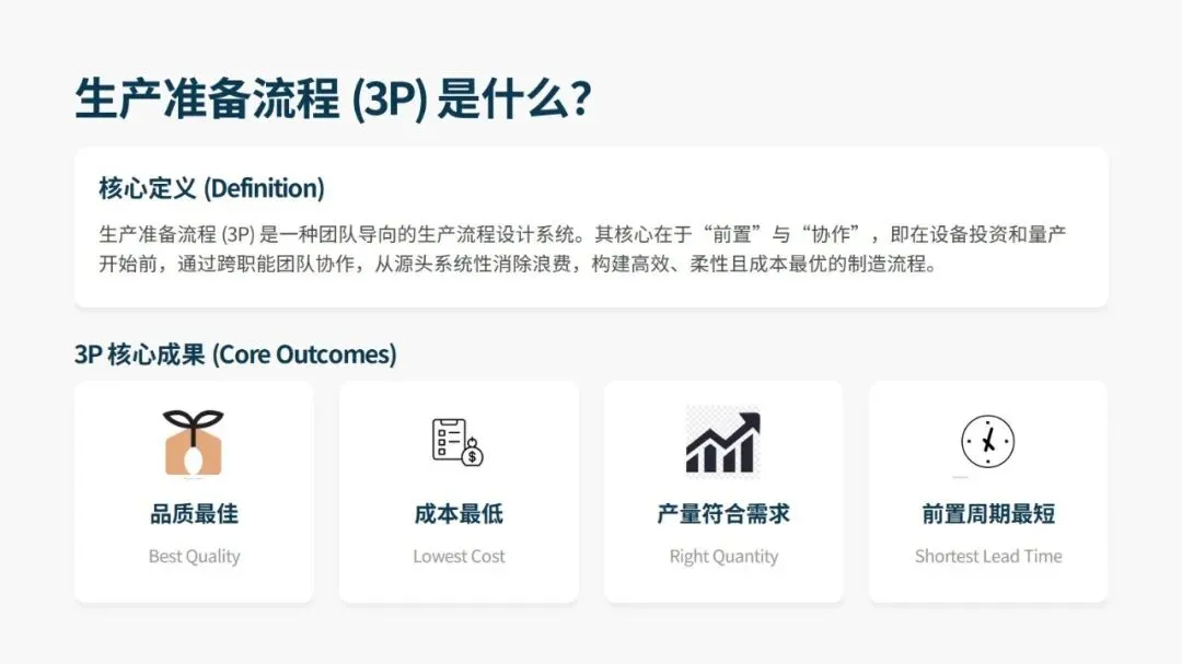 生产准备流程(3P)是精益生产体系的核心基石,是一套以跨职能团队协作为核心的生产流程设计方法,核心是把工作重心前置到设备投资、量产启动前,从源头系统性消除浪费,打造高效、柔性且成本最优的制造流程,最终实现品质最佳、成本最低、产量匹配需求、前置周期最短的目标。