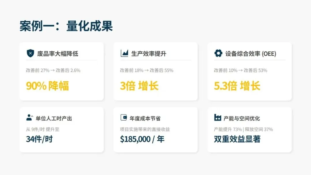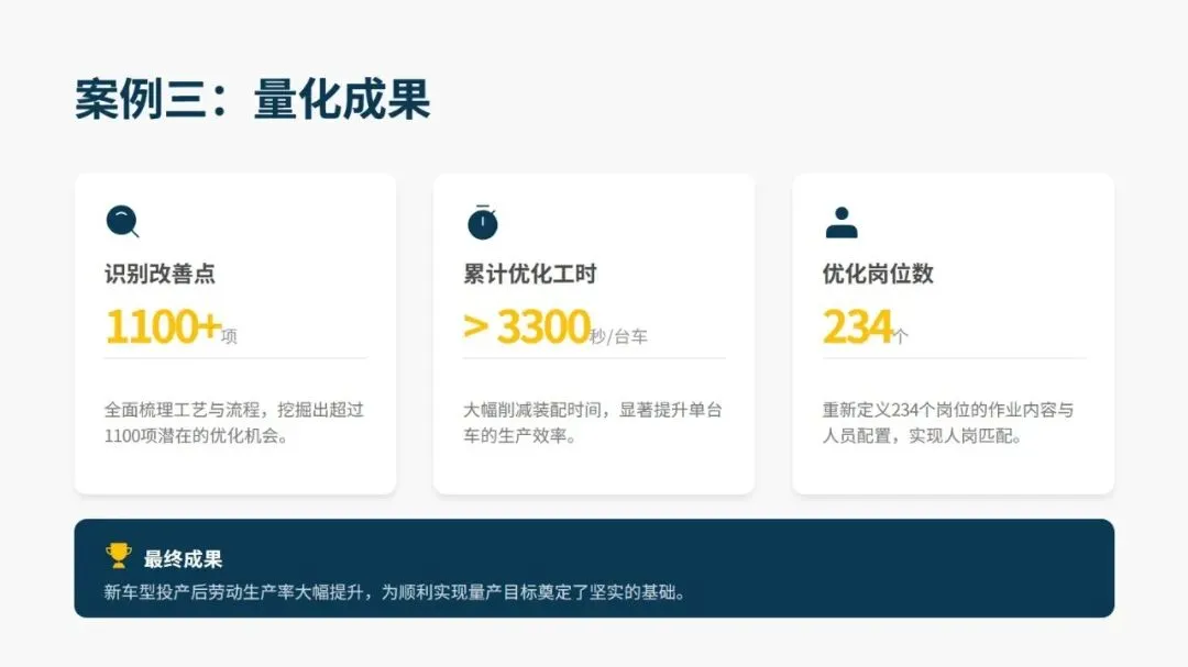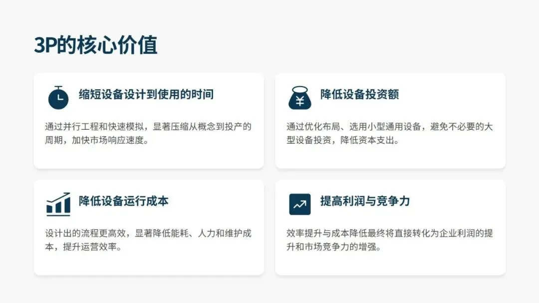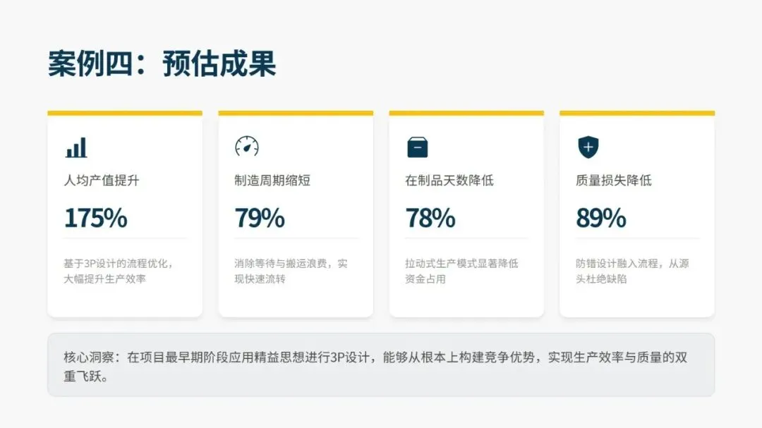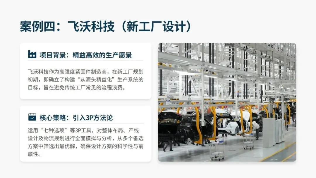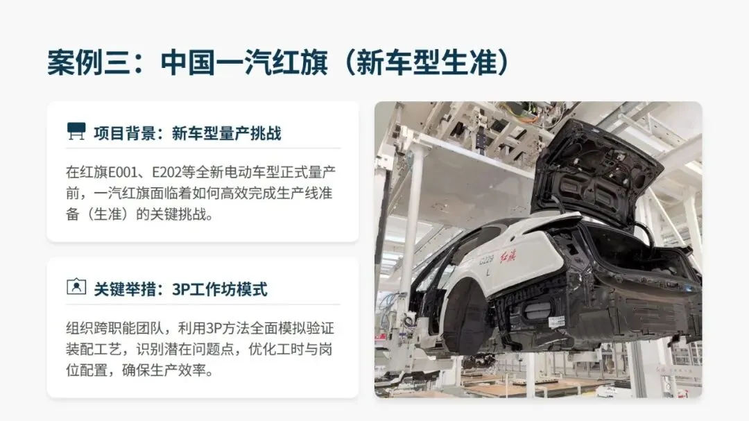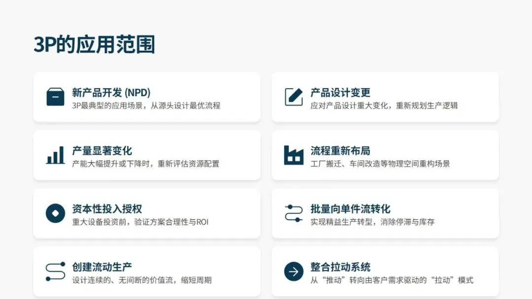 3P 的应用场景十分广泛,新产品开发、产品设计重大变更、产能大幅调整、工厂流程重构、重大设备投资验证等场景均适用,且在各行业落地均取得显著成果。汽车零部件供应商通过 3P 将废品率从 27% 降至 2.6%,一汽红旗在新车型生准中挖掘 1100 余项改善点,飞沃科技新工厂依托 3P 设计,预估人均产值提升 175%、制造周期缩短 79%。