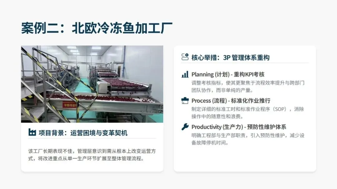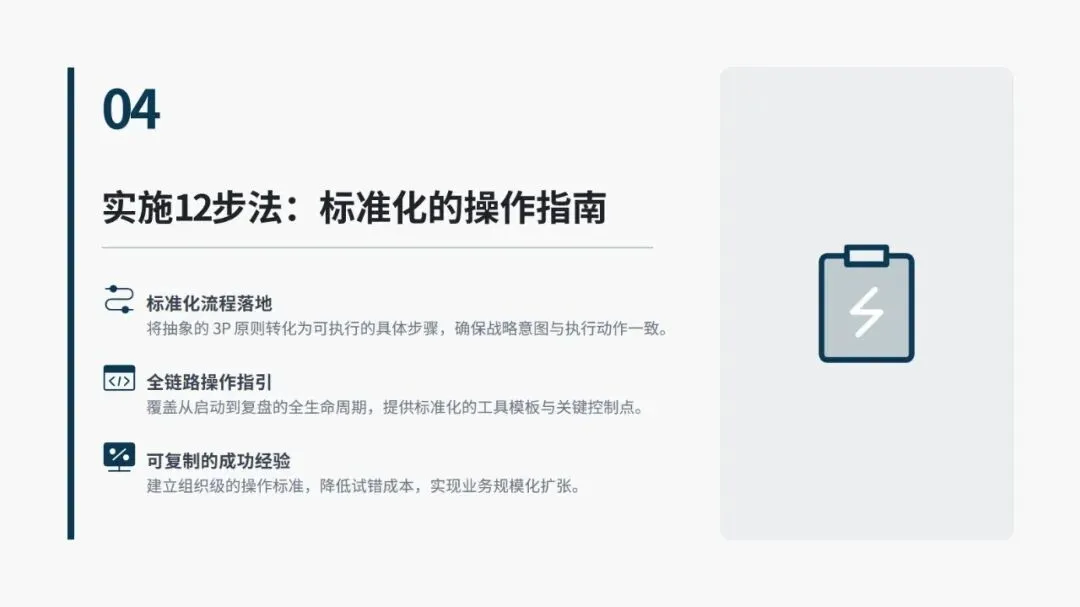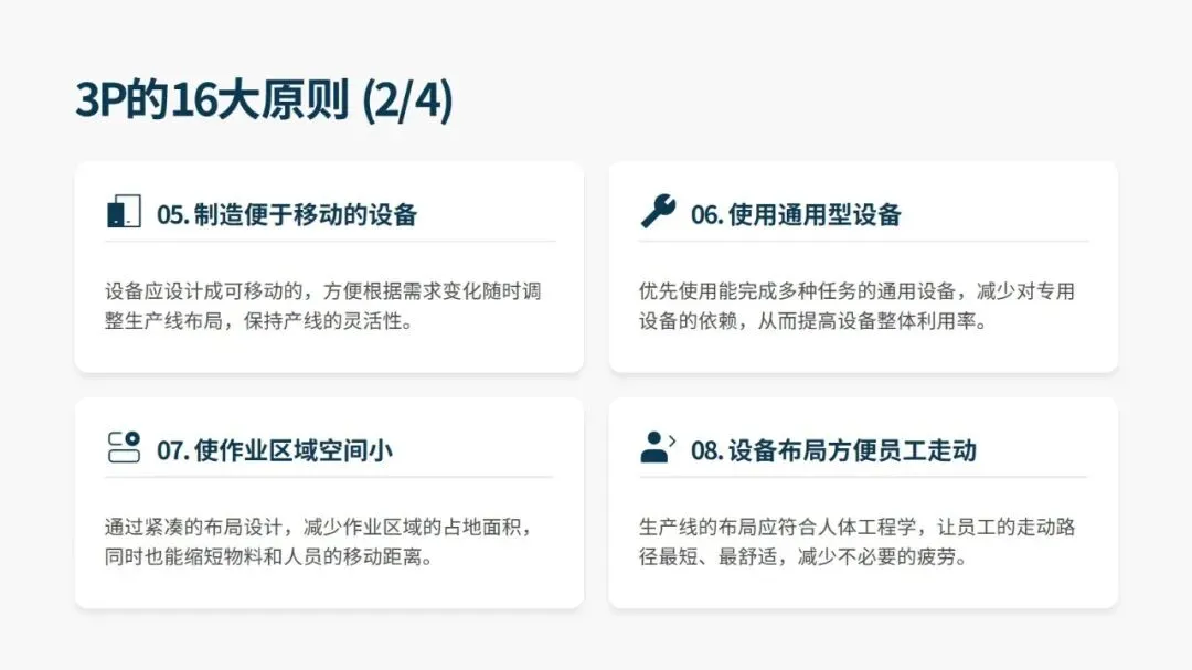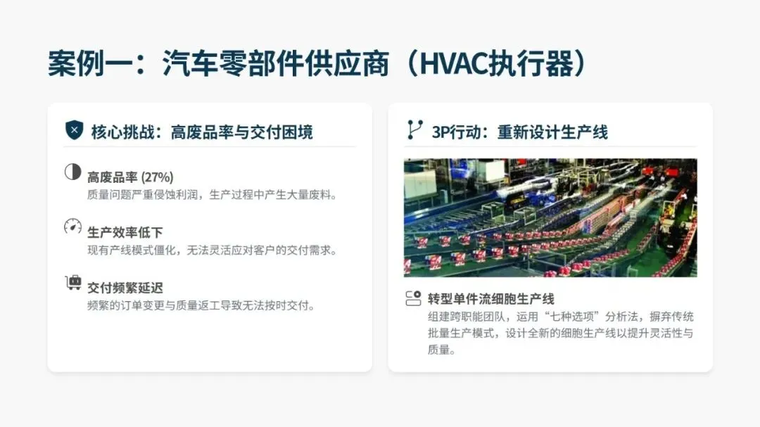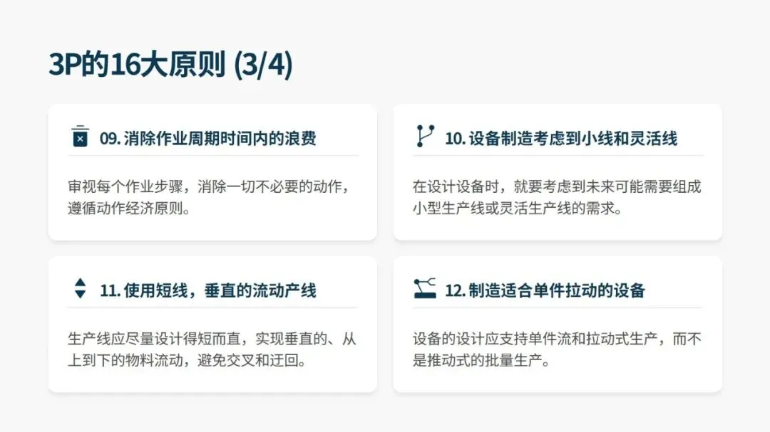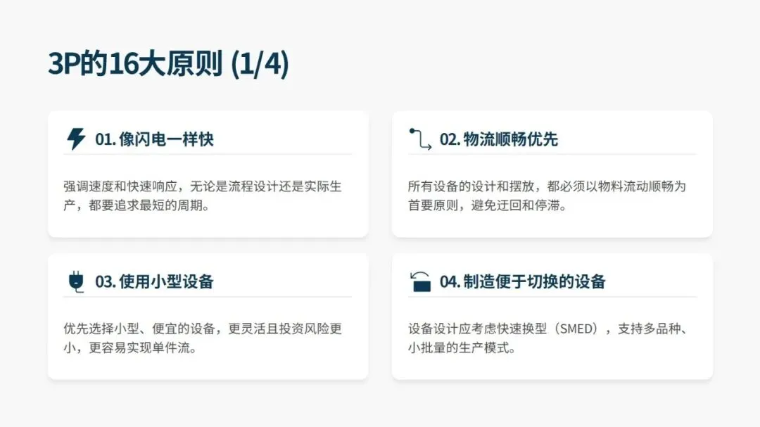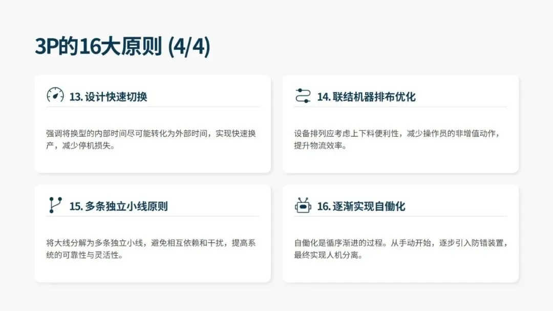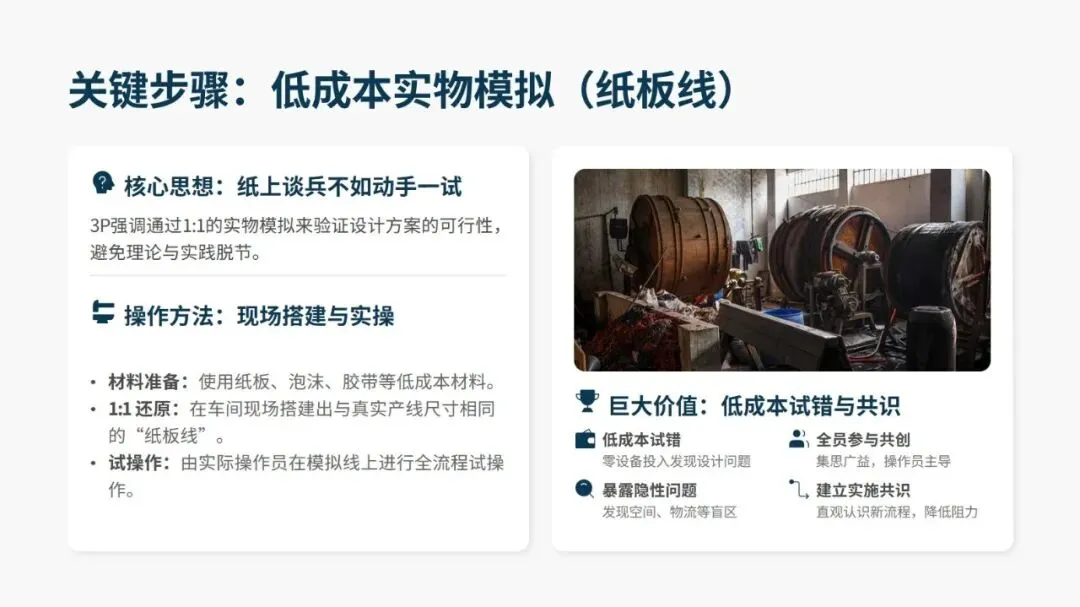 落地 3P 需遵循 16 大核心设计原则,覆盖设备选型、产线布局、生产模式等全维度,同时有标准化的 12 步实施法,分为启动与构思、评估与设计、实施与改善三大阶段。其中开发七种差异化流程方案、用纸板等低成本材料搭建 1:1 “纸板线” 做实物模拟是关键,既能低成本试错、暴露隐性问题,也能让一线员工深度参与,降低后续实施阻力。