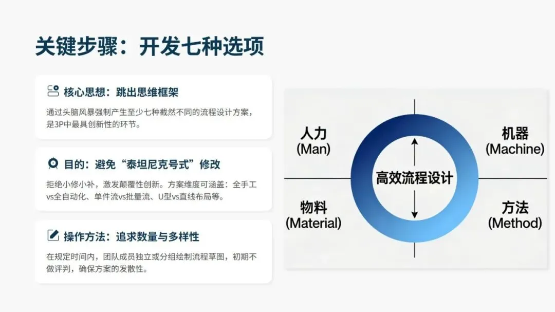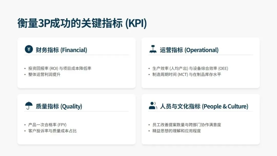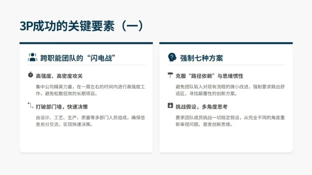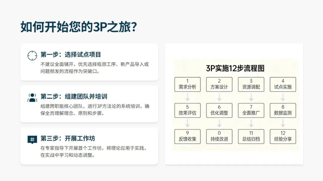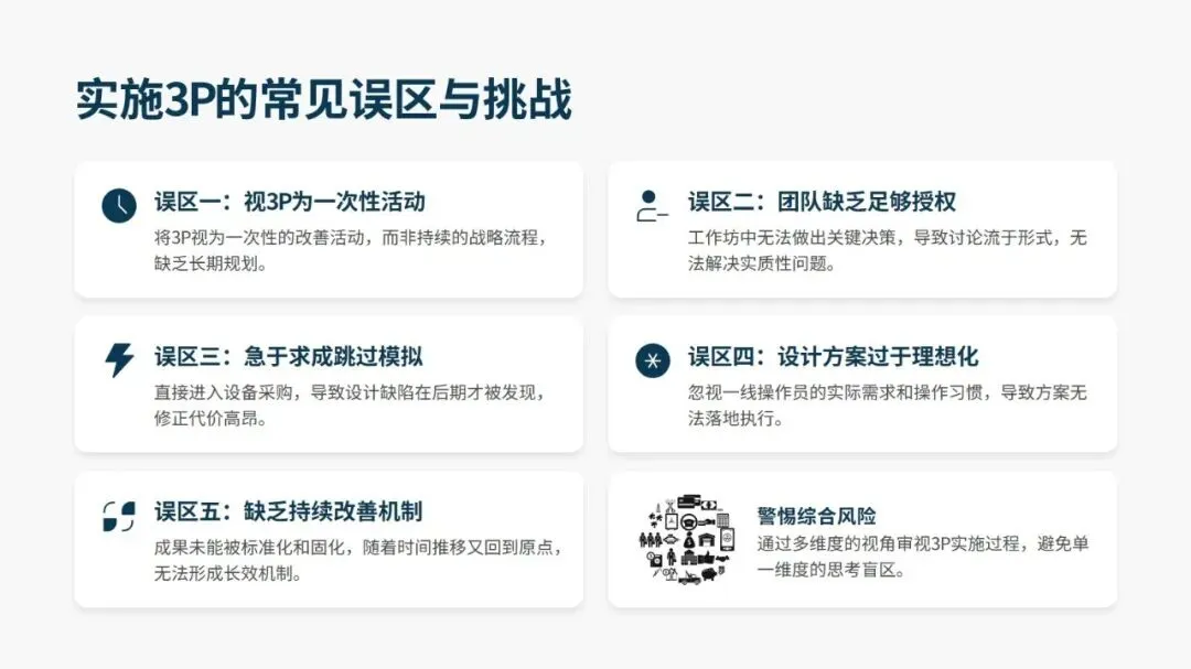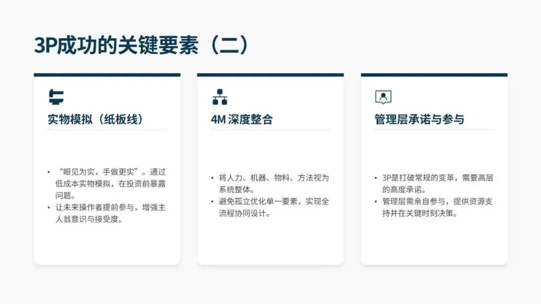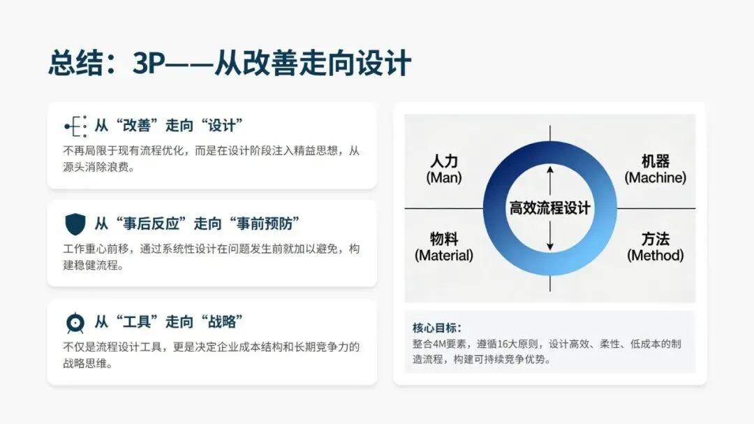 成功推进 3P,关键在跨职能团队的高强度集中攻关、强制突破思维惯性的方案设计、低成本实物模拟验证、4M 要素的深度整合,以及管理层的全程支持与授权。同时要规避将 3P 当作一次性活动、跳过模拟直接采购设备、设计方案脱离一线实际等误区。