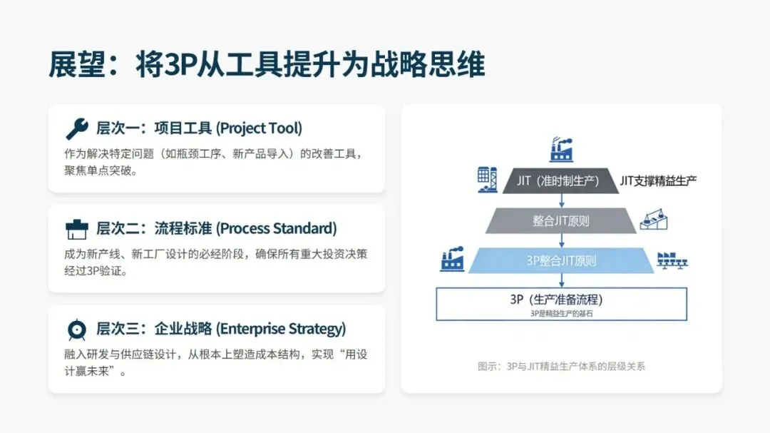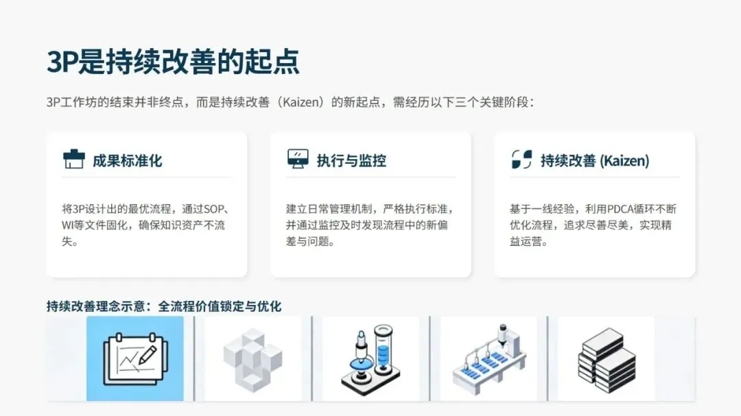 3P 绝非单一的改善工具,更应从解决单点问题的项目工具,升级为新产线、新工厂设计的流程标准,最终融入企业研发与供应链设计的顶层战略,从根本上塑造成本结构。而 3P 工作坊的结束只是起点,后续需将成果标准化、落地执行并持续监控优化,通过 PDCA 循环实现精益运营的持续升级。