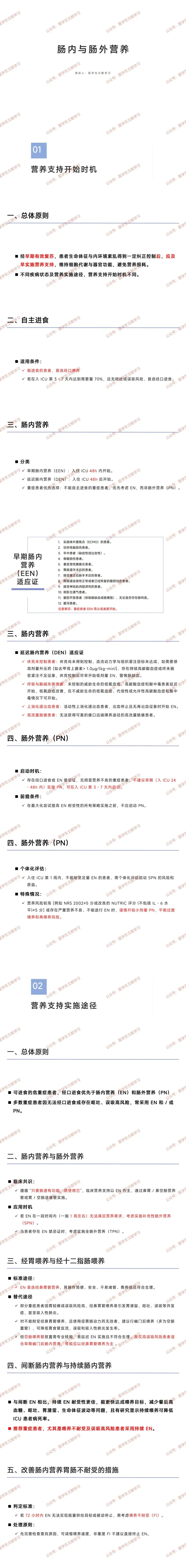 - 早期肠内营养(EEN):入住 ICU 48h 内启动,适用于 ECMO 患者、创伤性脑损伤、卒中、重症急性胰腺炎、胃肠道术后等 12 类患者,需从低速度开始。