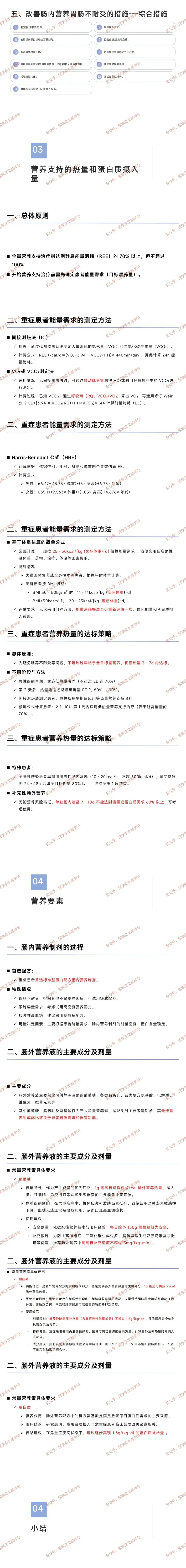 - 不同阶段:急性早期实施低热量喂养(≤70% EE);第 3 天后增至 80%-100% EE;IC 测定者后期行等热量支持,公式估算者第 1 周低热量喂养。