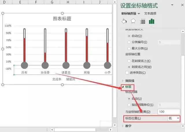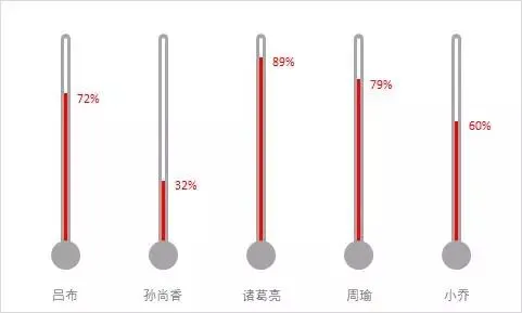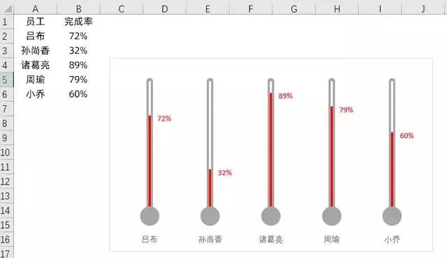 如下表,左边为各员工数据完成率,使用温度计图做了可视化展示。