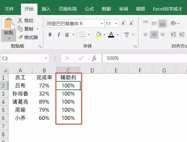 在C列插入一辅助列,内容均填充为100%。