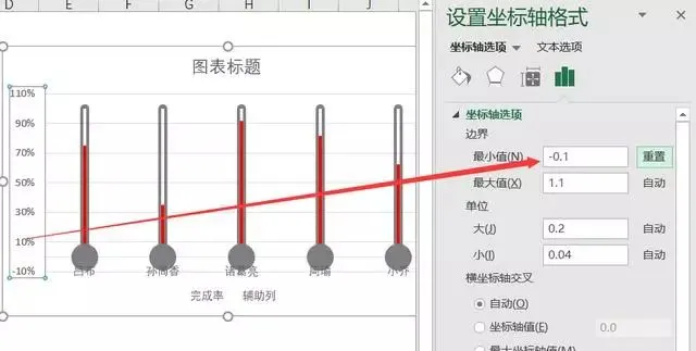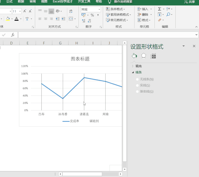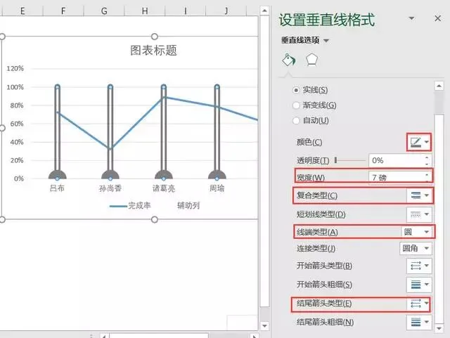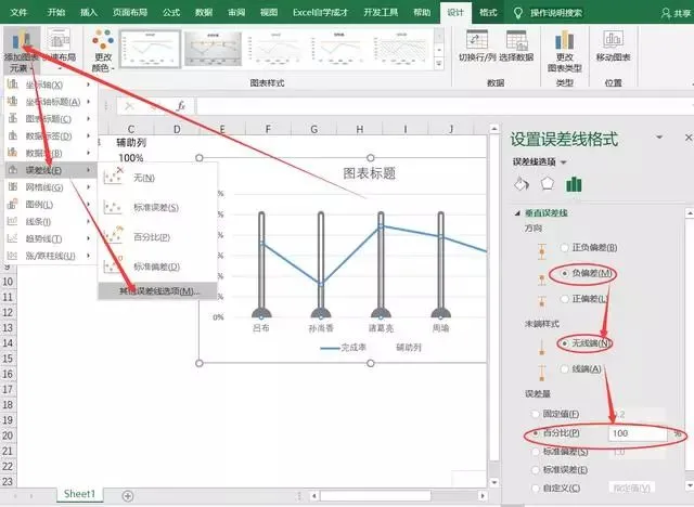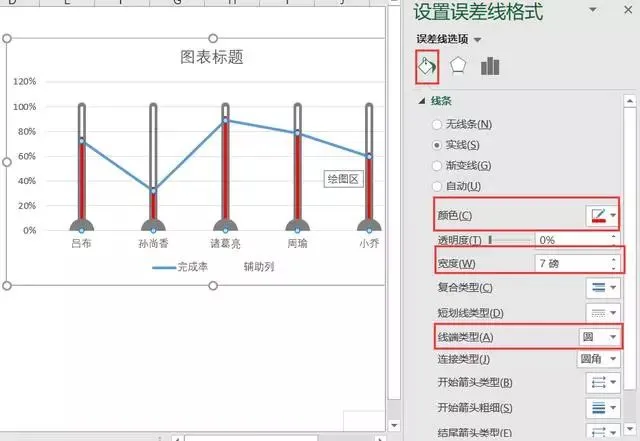 首先选择完成率系列线条,添加图表元素,选择误差线,在误差线选项中,选择负偏差,无线端,误差量选择百分比,100%。