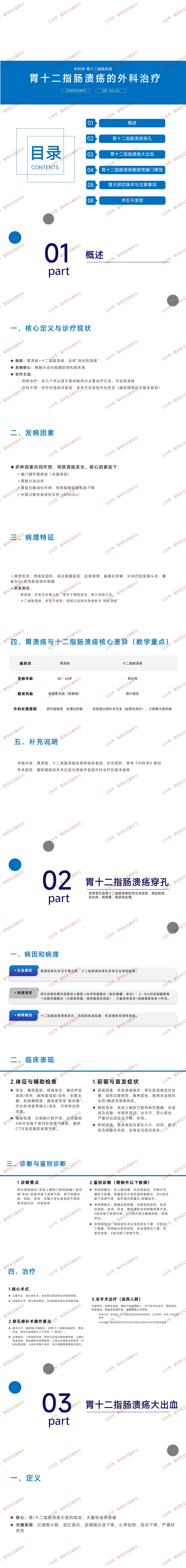 - 病理演变:穿孔后酸性胃内容物流入腹腔→化学性腹膜炎(6~8 小时后发展为化脓性腹膜炎)→休克,胃溃疡穿孔多见于胃小弯,十二指肠溃疡穿孔多在球部前壁。