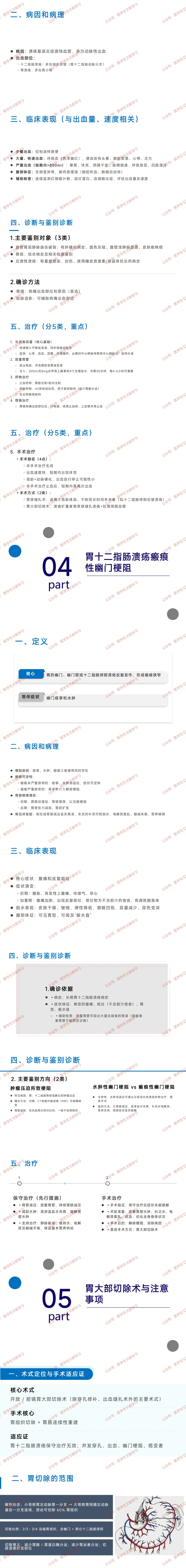 - 外科原则:胃溃疡处理更积极,十二指肠溃疡并发症多以修补术为主,少用胃大部切除。