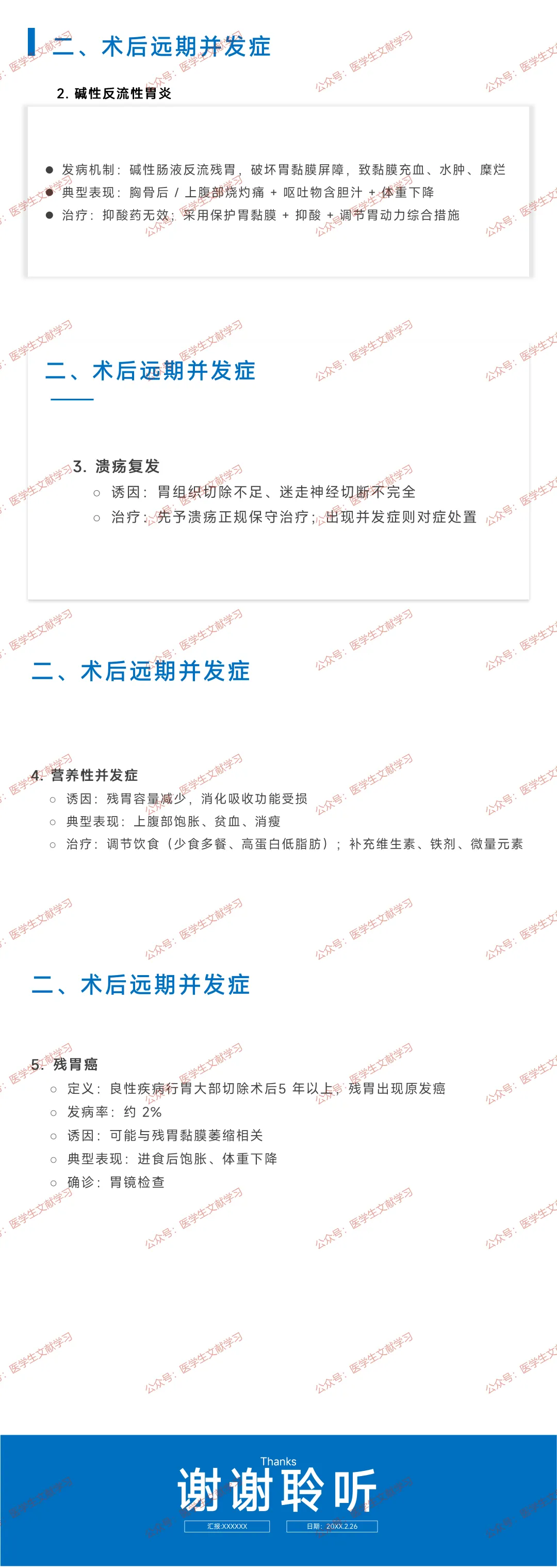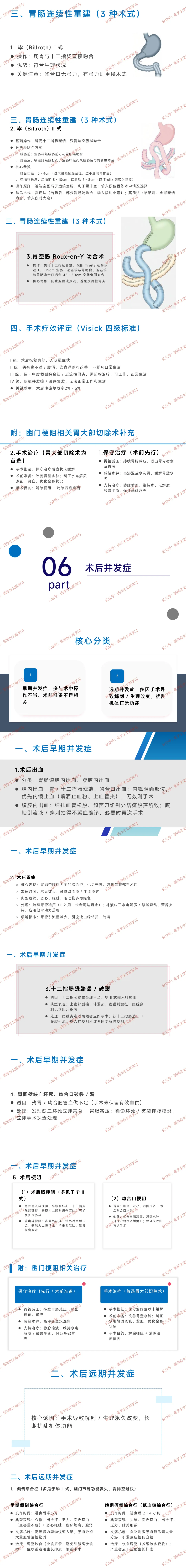 - 其他:溃疡复发(胃切除不足 / 迷走神经切断不完全)、营养性并发症(贫血、消瘦,需补充维生素 + 铁剂)、残胃癌(术后 5 年以上残胃原发癌,胃镜确诊)。