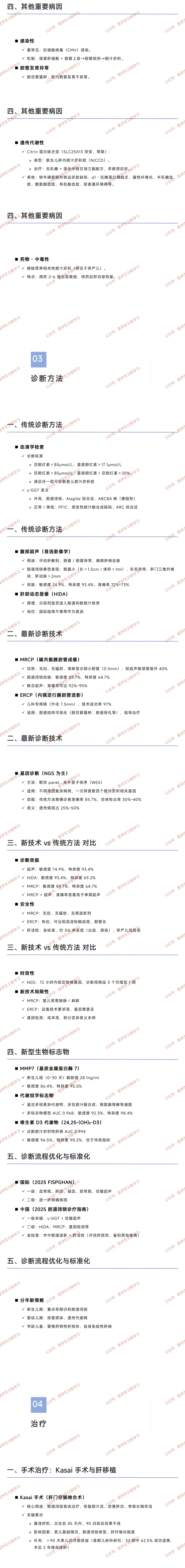- 国际 / 中国指南:一级筛查(血常规、肝功、凝血、尿常规、空腹超声),二级进一步检查(HIDA、MRCP、基因检测),金标准为术中胆道造影 + 肝活检。