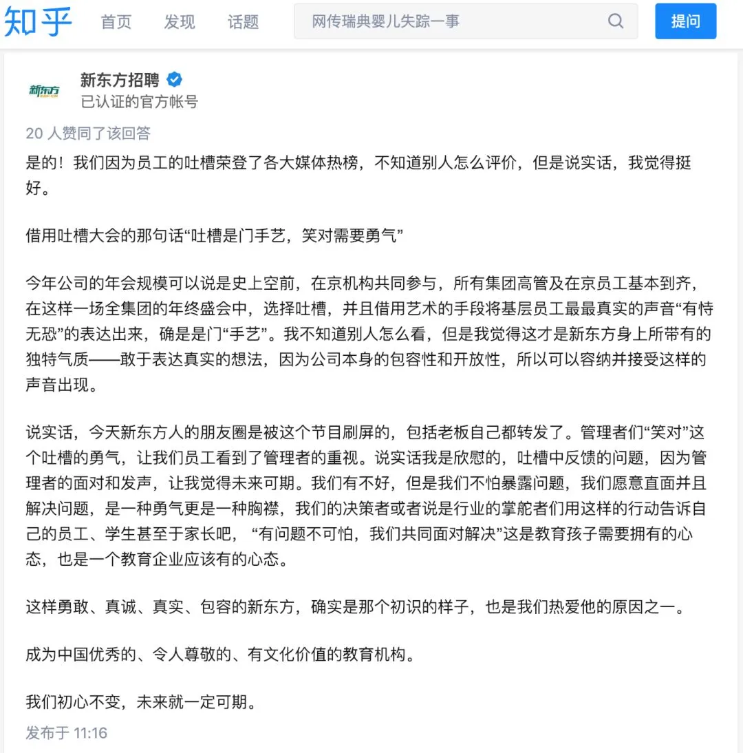 当天,“新东方招聘”也在知乎平台回应称,这才是新东方身上所带有的独特气质——敢于表达真实的想法,因为公司本身的包容性和开放性,所以可以容纳并接受这样的声音出现。