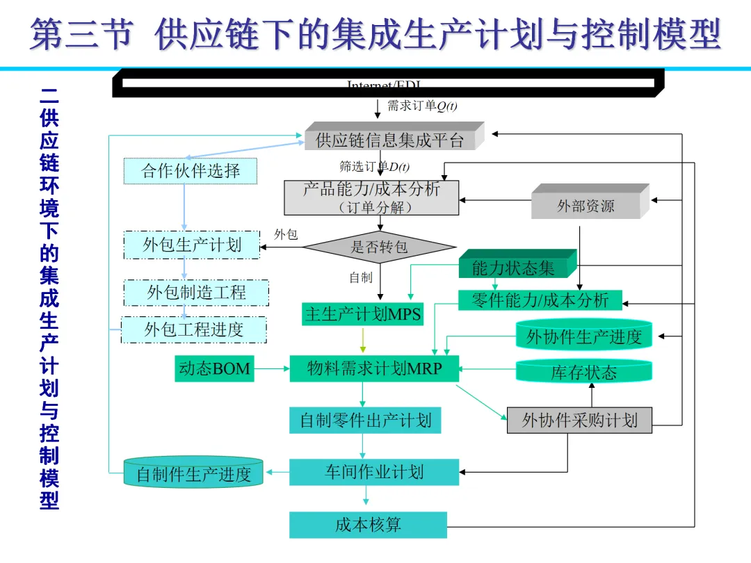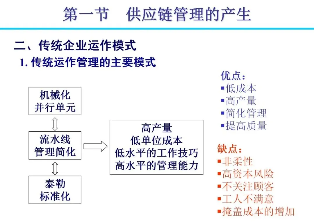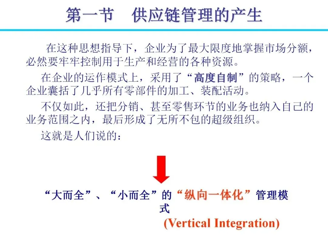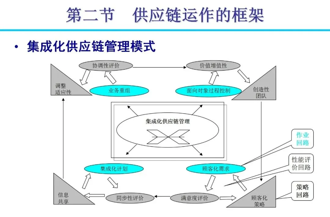 传统企业多采用“纵向一体化”模式,囊括从生产到分销的全流程,导致资源分散和效率低下。随着消费需求个性化、制造全球化等变化,管理模式逐步向“横向一体化”转变。企业通过外包非核心业务,与供应商、分销商建立战略联盟,形成扩展企业。这种模式降低资本风险,提高柔性,例如日本企业通过准时生产减少浪费,实现零库存目标。合作中,信息共享是关键,避免“牛鞭效应”带来的需求扭曲。