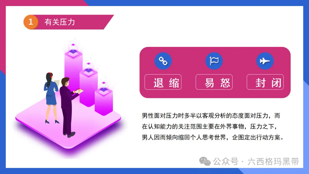 研究表明,男性和女性在面对压力时的应对方式存在显著差异。男性通常以客观分析的态度面对压力,更倾向于将注意力集中在外界事物上。在压力之下,男性往往会选择独自思考,试图制定行动方案。相比之下,女性可能更倾向于通过交流和分享来缓解压力。了解这种差异有助于企业在管理中采取更具针对性的措施,帮助员工更好地应对压力。