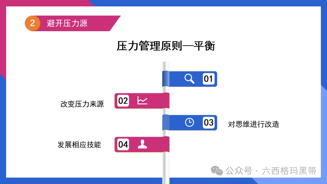 压力管理的核心原则是“平衡”,即通过多种方式实现心理和生理的平衡状态。具体而言,可以从以下三个方面入手:改变压力来源、对思维进行改造以及发展相应技能。通过这些方法,我们可以更好地应对压力,避免其对身心健康造成负面影响。