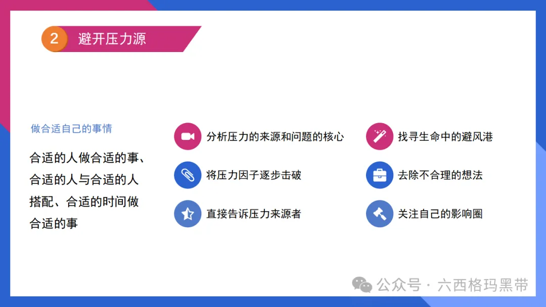 - 合适的人做合适的事:了解自己的优势和兴趣,选择与之匹配的工作岗位和任务,可以有效提高工作效率,减少因能力不匹配带来的压力。