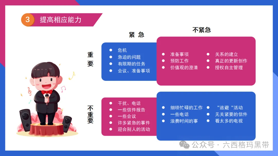 通过时间管理矩阵,我们可以更好地掌控自己的时间,避免因任务积压或时间管理不当带来的压力,从而提高工作效率和生活质量。