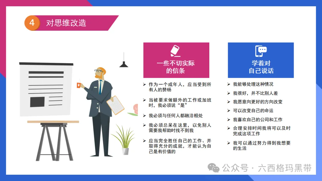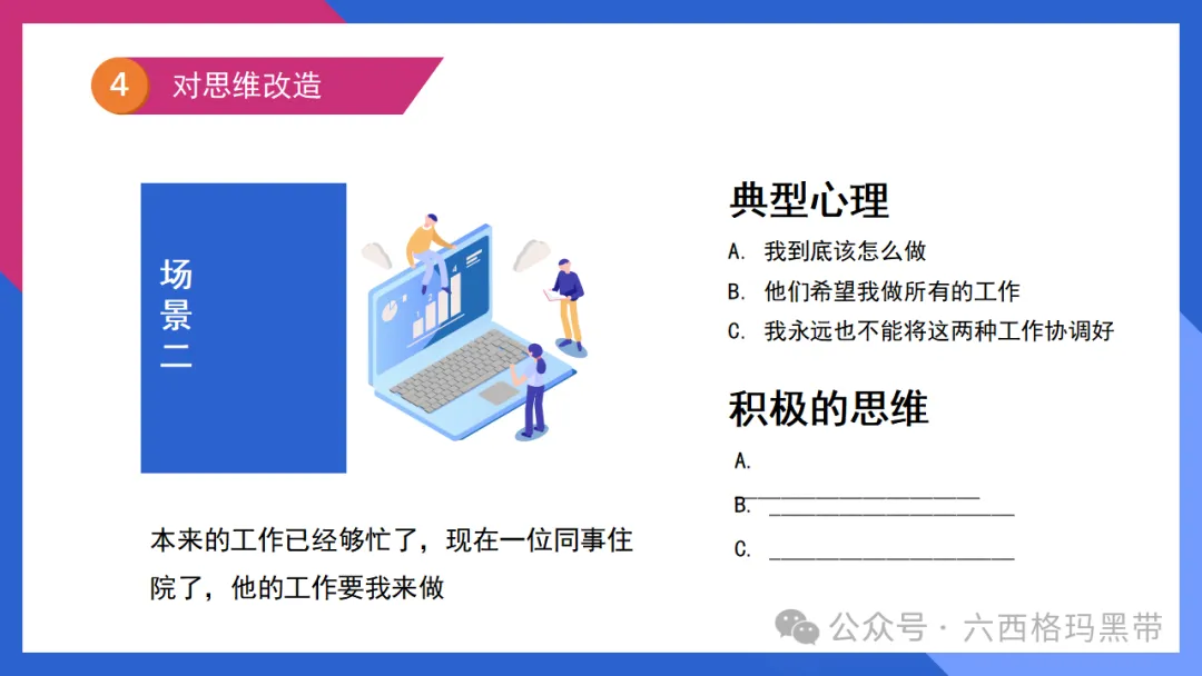 这些消极想法会导致焦虑和压力的积累,影响工作效率和生活质量。相反,如果能够用积极的思维方式去应对,例如: