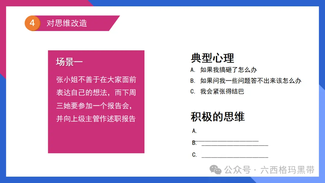 在工作中,我们常常需要在公开场合进行述职报告或演讲。这种场合往往会给很多人带来紧张和焦虑的情绪。例如,张小姐不善于在大家面前表达自己的想法,而下周三她要参加一个报告会,并向上级主管作述职报告。面对这种情况,她可能会产生以下消极想法: