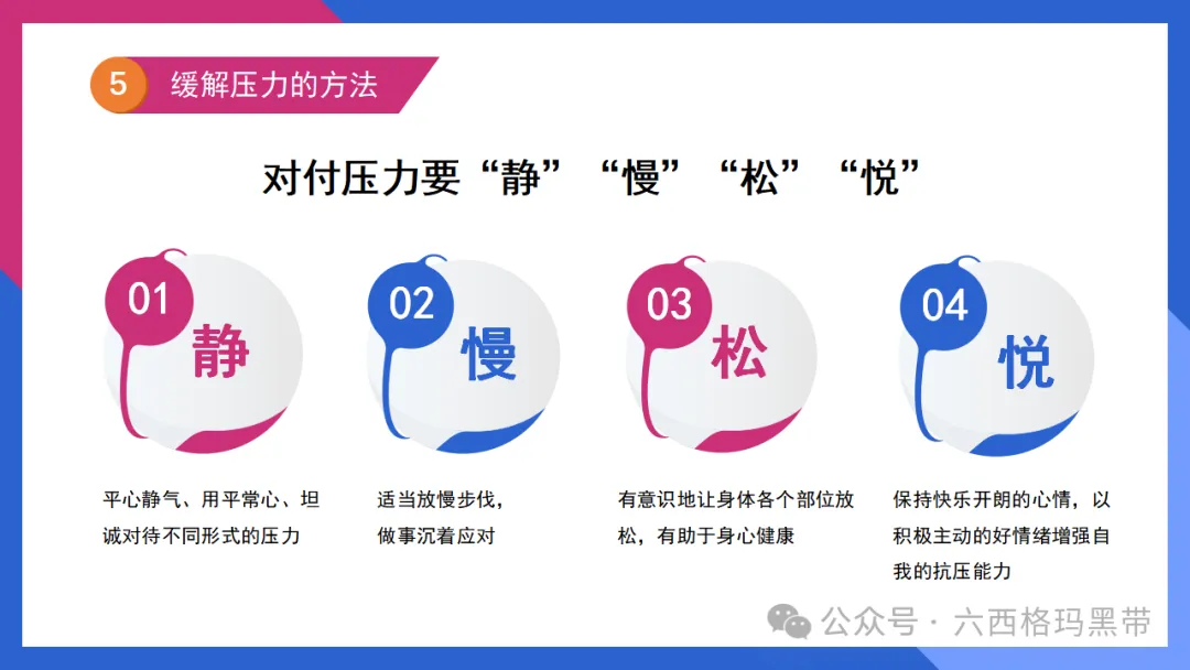 - “静”:平心静气,用平常心对待压力。面对压力时,保持冷静和理智,避免因情绪波动而影响判断。