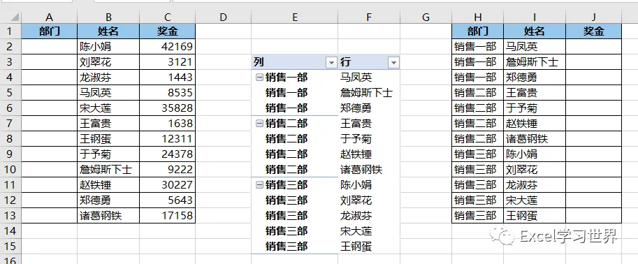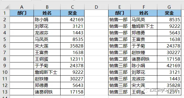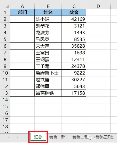 下图 1 至 3 是每个以部门命名的工作表,其中列出了个部门的员工姓名。下图 4 的奖金汇总表中,没有员工的部门,如何快速匹配上?