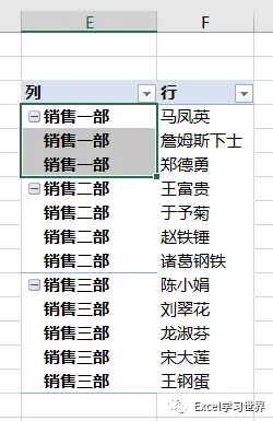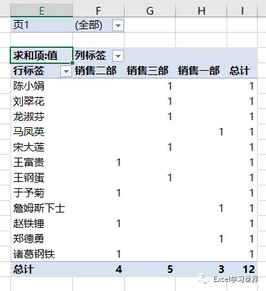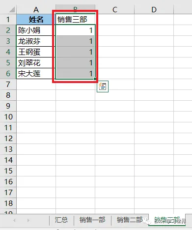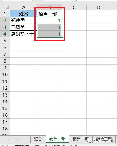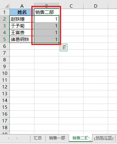1. 给“销售一部”工作表中的数据表添加辅助列:标题为“销售一部”,数据全部填充“1”
