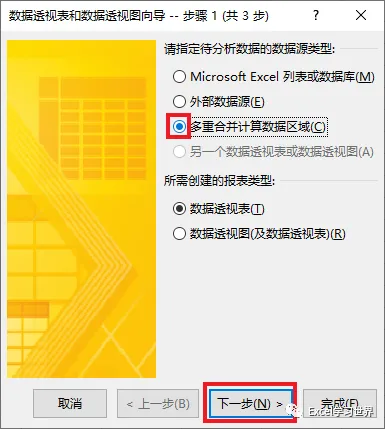 3. 按 Alt+D+P --> 在弹出的对话框中选择“多重合并计算数据区域”--> 点击“下一步”