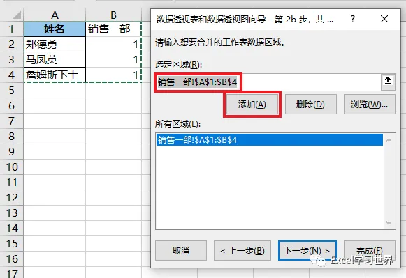 5. 在弹出的对话框中选择“销售一部”工作表中的整个数据表 --> 点击“添加”按钮将其添加到区域