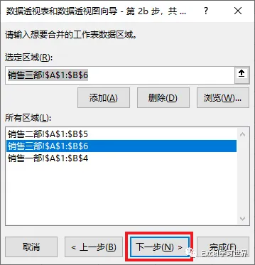 6. 重复同样的步骤将所有工作表中的数据表都添加到区域 --> 点击“下一步”