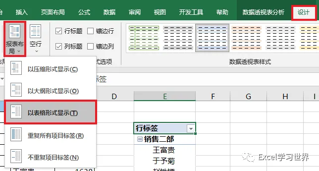 9. 选中数据表的任意单元格 --> 选择菜单栏的“设计”-->“报表布局”-->“以表格形式显示”