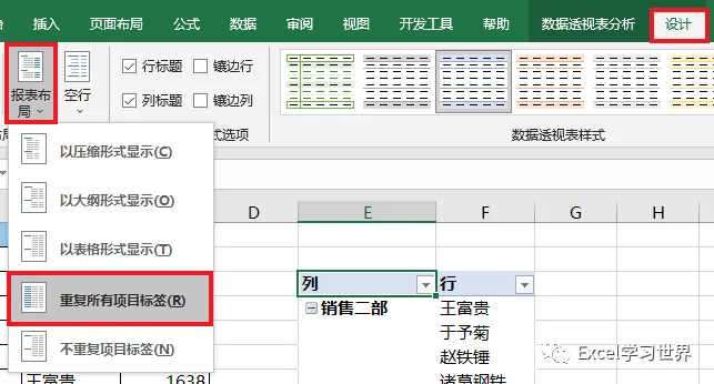 10. 选择“设计”-->“报表布局”-->“重复所有项目标签”