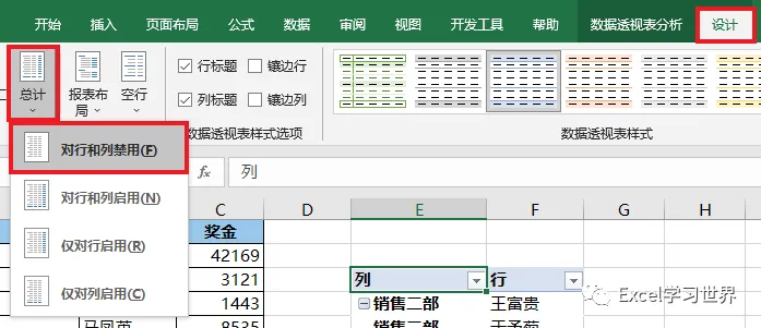 11. 选择“设计”-->“总计”-->“对行和列禁用”