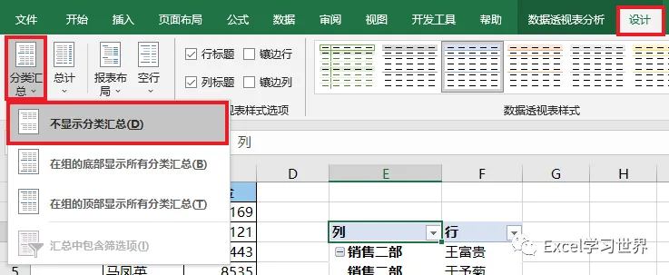 12. 选择“设计”-->“分类汇总”-->“不显示分类汇总”