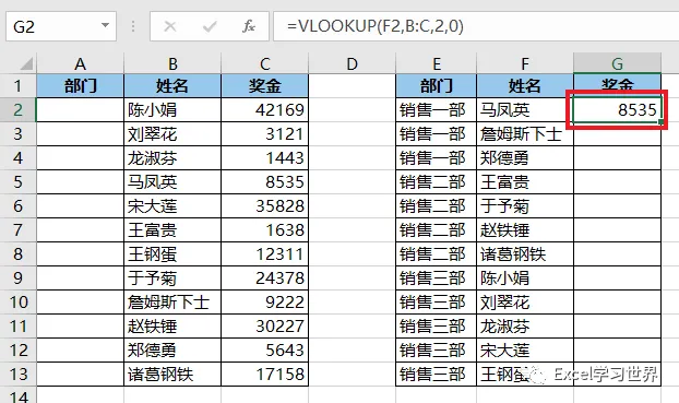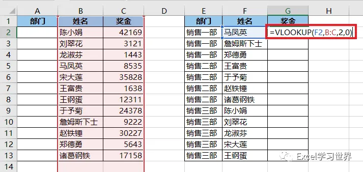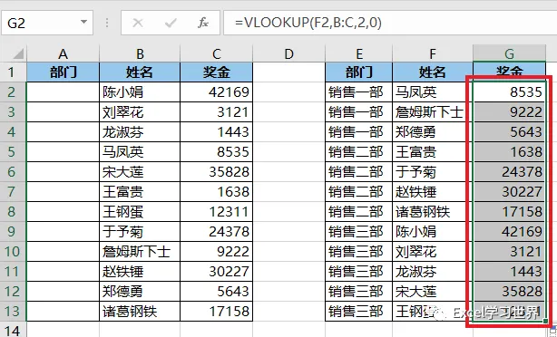 16. 删除数据透视表 --> 在 G2 单元格中用 vlookup 公式查找姓名对应的奖金 --> 下拉复制公式
