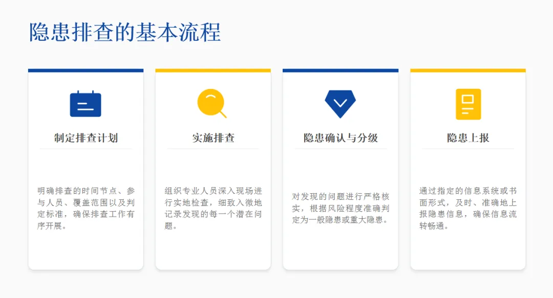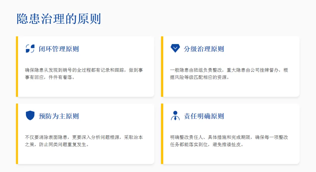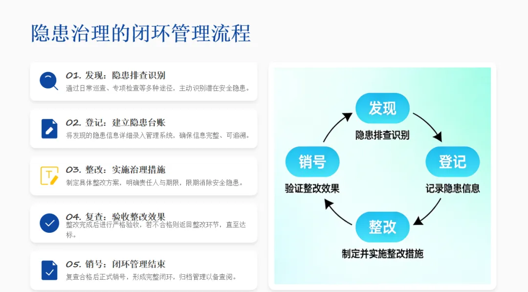 🔍 闭环治理:遵循“发现-登记-整改-复查-销号”流程,实现隐患清零