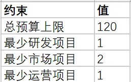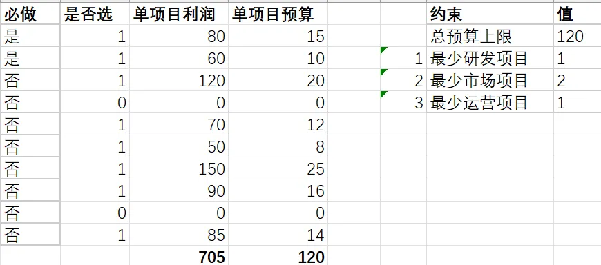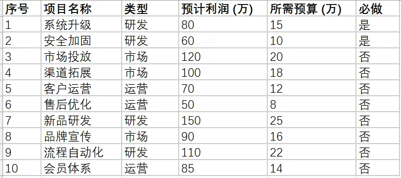 假设一个公司有10个项目,有2个是必做的,另外8个项目分3类,每类都有最少要做的项目个数,每个项目有预算和预计利润,总预算有上限,要求项目最大的利润及选择的项目。
