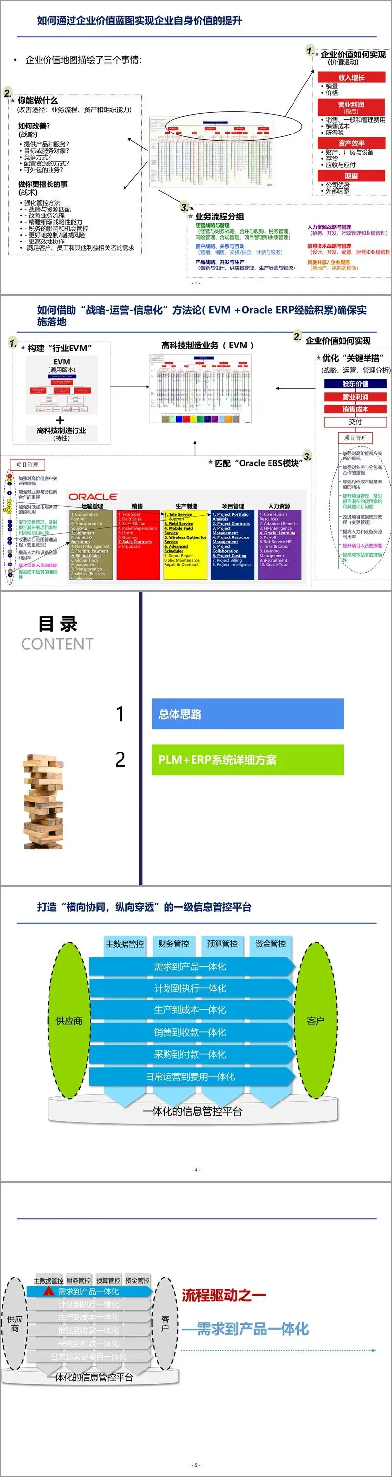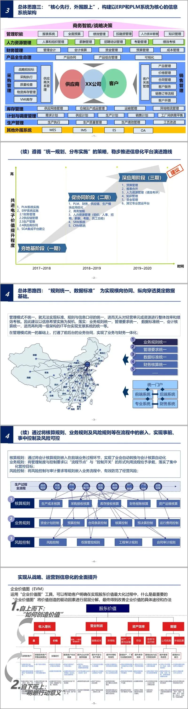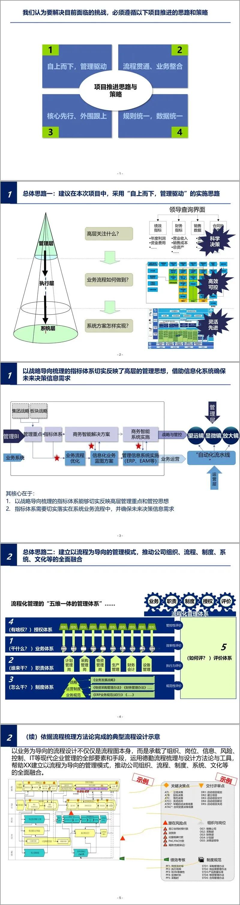 方案提出了"自上而下,管理驱动"的实施理念,强调以企业战略为导向,通过指标体系反映高层管理思想,借助信息化系统确保决策信息需求。企业需要建立以流程为导向的管理模式,推动组织、流程、制度、系统、文化等的全面融合,构建"五维一体的管理体系"。