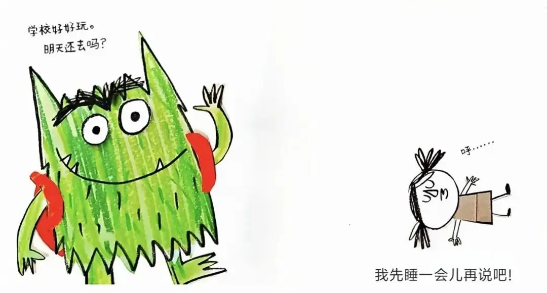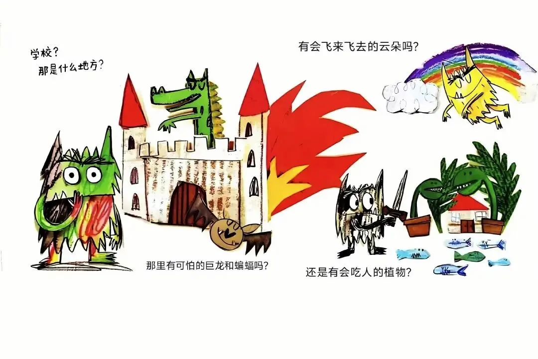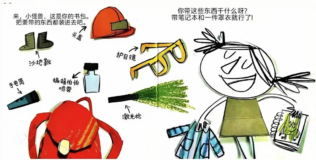 学校?那是什么地方?那里有可怕的巨龙和蝙蝠吗? 有会飞来飞去的云朵吗?还是有会吃人的植物?来,小怪兽,这是你的书包。把要带的东西都装进去吧:头盔、沙地靴、护目手电筒、蝙蝠怕怕喷雾、激光枪......