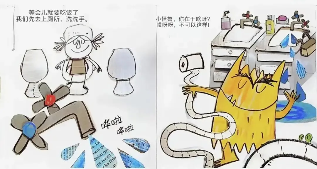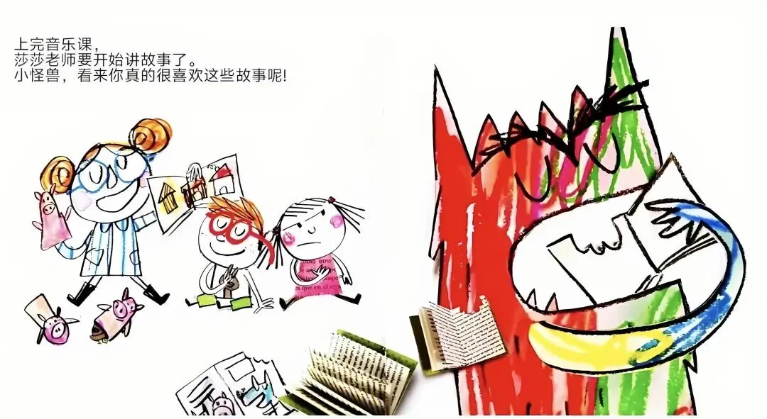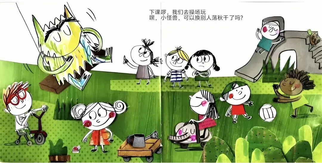 上完音乐课,莎莎老师要开始讲故事了。小怪兽,看来你真的很喜欢这些故事呢!下课啰,我们去操场玩。嘿,小怪兽,可以换别人荡秋千了吗?等会儿就要吃饭了,我们先去上厕所、洗洗手。