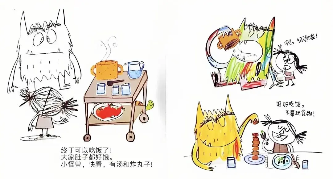 终于可以吃饭了!大家肚子都好饿。小怪兽,快看,有汤和炸丸子!啊,很烫哦!