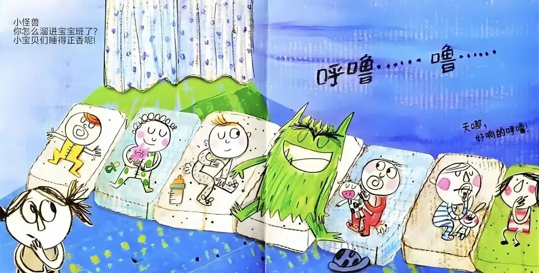 小怪兽,你怎么溜进宝宝班了?小宝贝们睡得正香呢!天哪,好响的呼噜!下午是体育课,跟大家一起去运动吧。