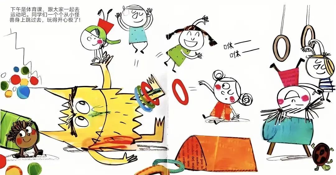 同学们一个个从小怪兽身上跳过去,玩得开心极了!
