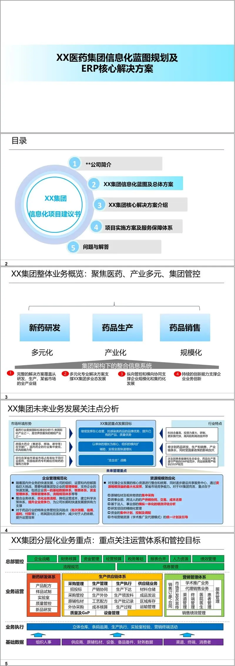 《XX医药集团信息化蓝图规划及ERP核心解决方案》文件,系统性地描绘了XX医药集团在数字化转型过程中的整体架构与实施路径。作为一家聚焦医药产业、实行多元化发展与集团化管控的企业,XX集团当前面临着系统分散、信息孤岛、业务流程不规范、集团管控乏力等核心挑战。为此,本规划提出以ERP系统为核心,构建一套覆盖研发、生产、销售全产业链的一体化信息平台,支撑集团规模化、集约化与创新化发展。