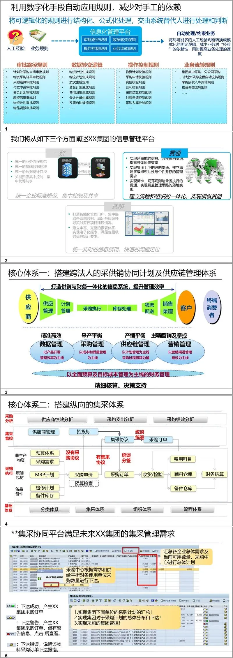 一是供应链与产销协同体系。通过计划管理主线,整合销售预测、生产计划与采购执行,实现采产平衡与产销协同。特别是集采体系的建设,通过分类、组织、流程、预算四层体系,实现集团统一采购管控与执行跟踪,提升议价能力与物资统筹效率。