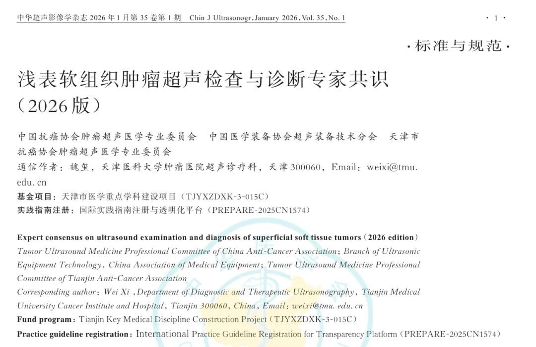 《浅表软组织肿瘤超声检查与诊断专家共识(2026 版)》由多协会联合制定,旨在规范该领域超声诊疗操作、统一诊断术语与报告模式,为临床术前评估和术后随访提供标准化依据。共识经循证检索筛选高质量文献,结合专家临床经验与投票形成 11 项推荐意见。